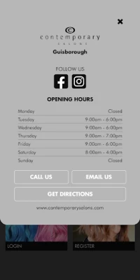 The Contemporary Salons booking app allows clients to log on and make bookings online under their own profile 24/7. Clients can track loyalty points as well as looking at historic and future bookings and get directions for their favourite salon.
