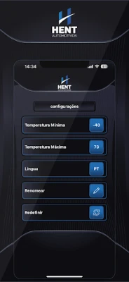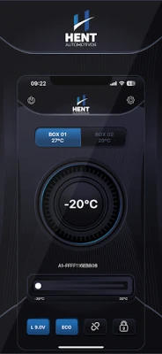 Conectando a Geladeira Hent Automotivos pelo aplicativo, é possível verificar a temperatura, voltagem e outras informações da geladeira, como configuração da temperatura e ligar/desligar a geladeira.
