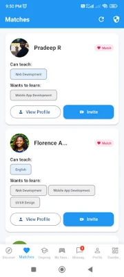 • **Swipe & Match**: Browse profiles of skilled teachers and eager learners